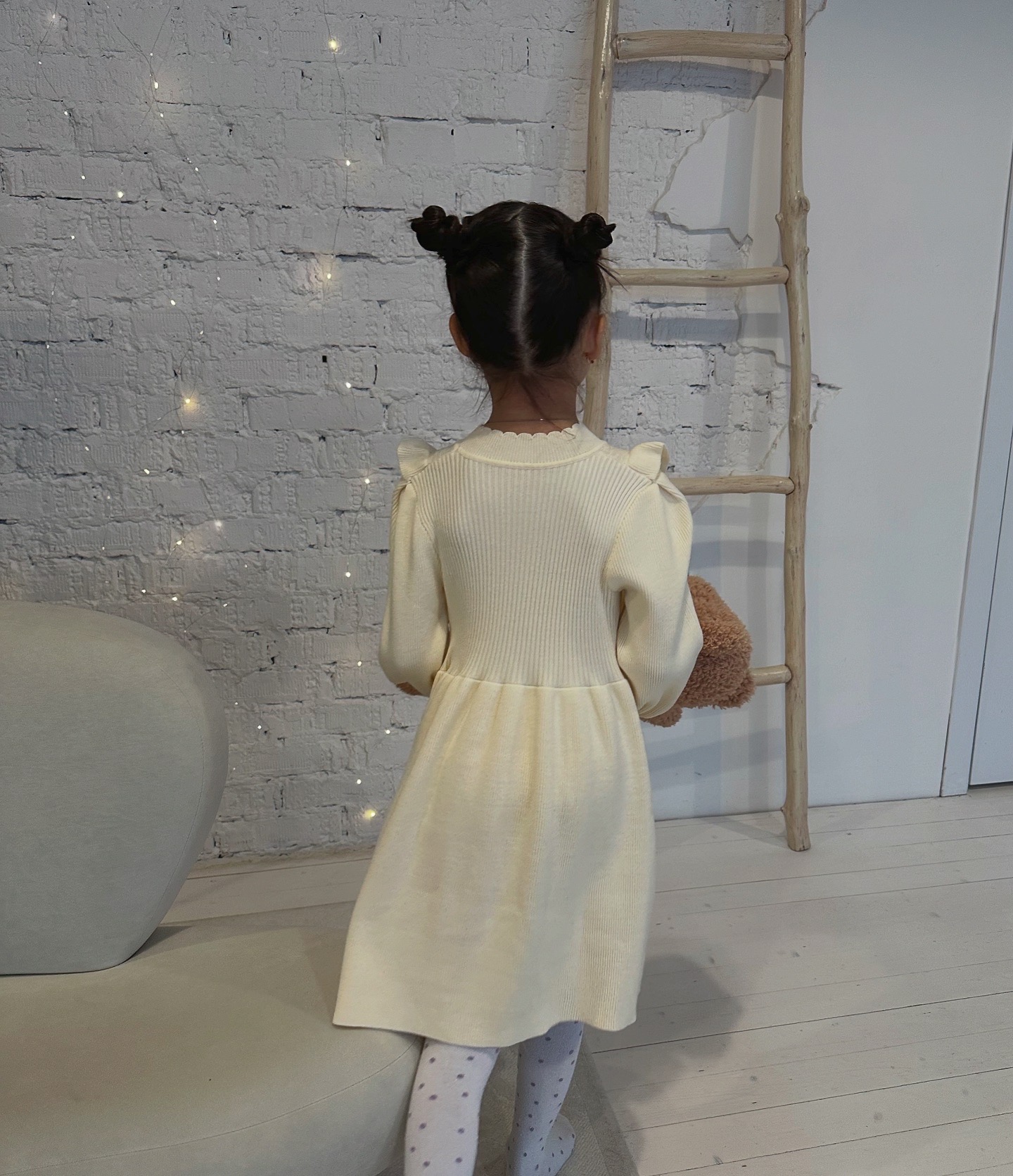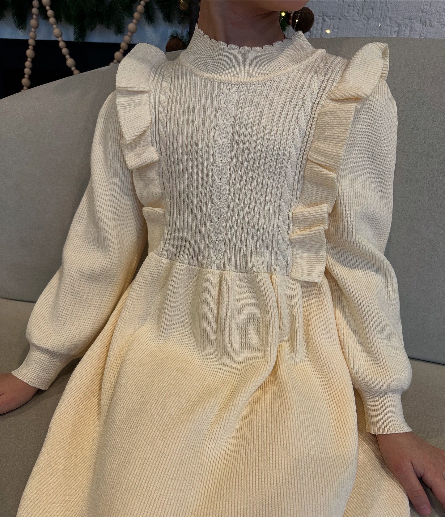 Платье из мягкого трикотажа. Модель украшена рюшами и стильной вязкой , что придаёт образу особый шарм. Платье не только смотрится очень нарядно, но и невероятно удобно благодаря эластичной ткани, которая бережно обнимает и согревает. Свободный крой не стесняет движений, а нейтральный молочный оттенок подойдёт к любым аксессуарам и обуви.
